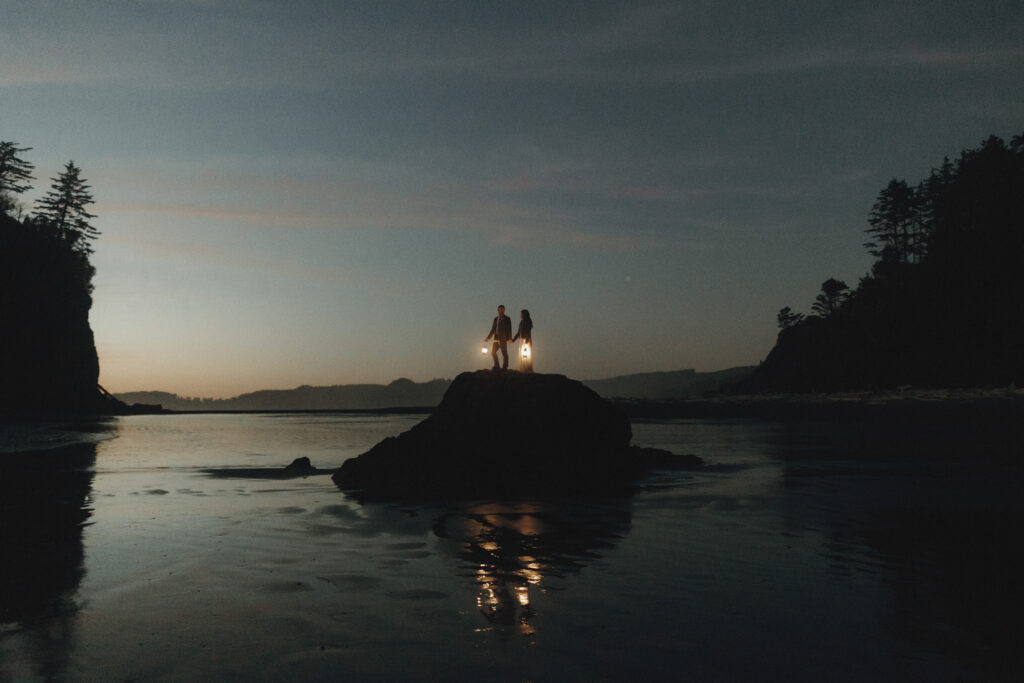 Couple holding lanterns during blue hour after their elopement in Olympic National Park, Washington with moody twilight sky and forest silhouette.